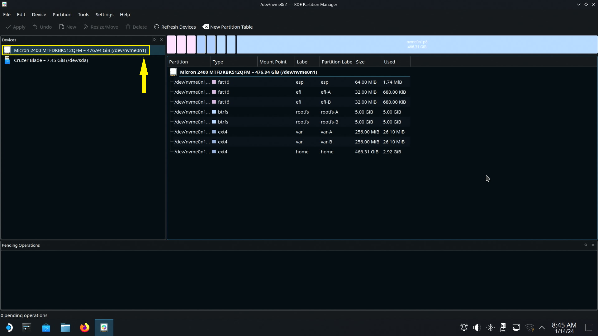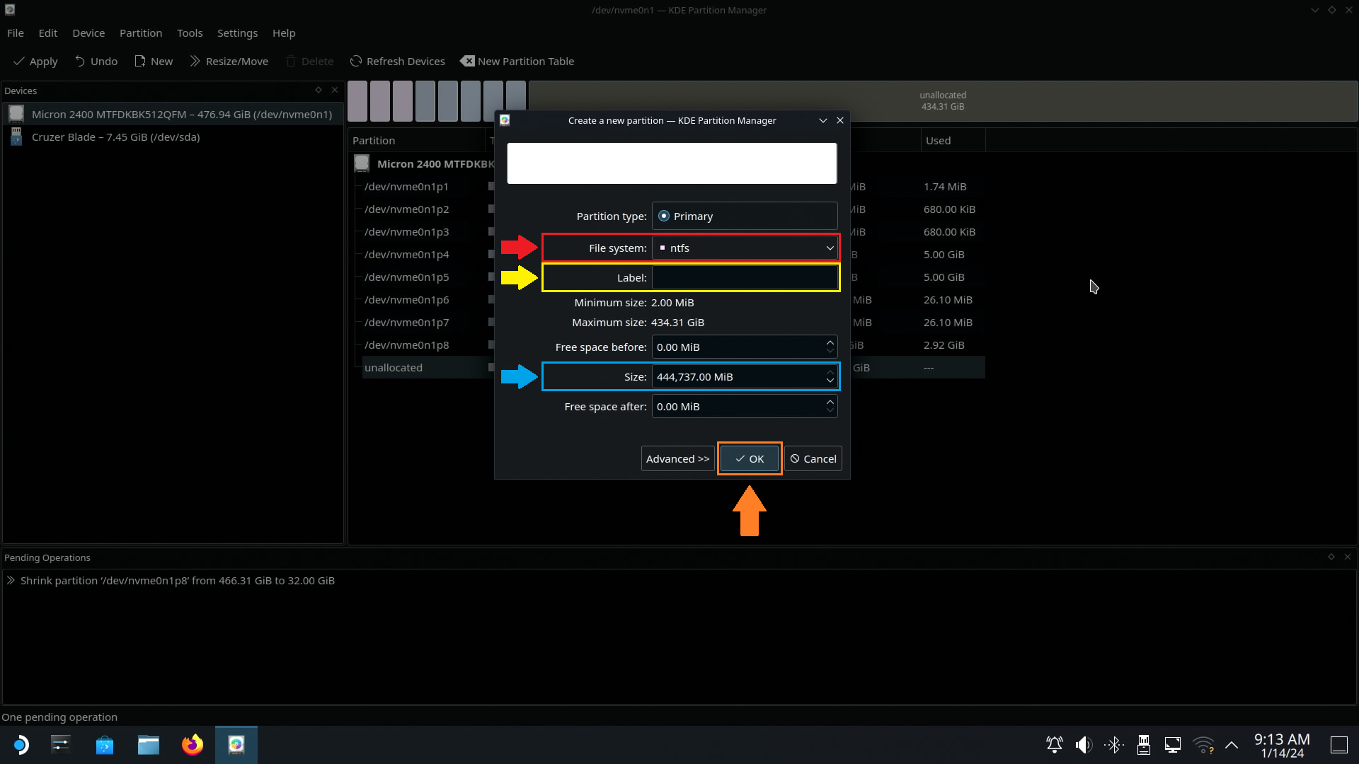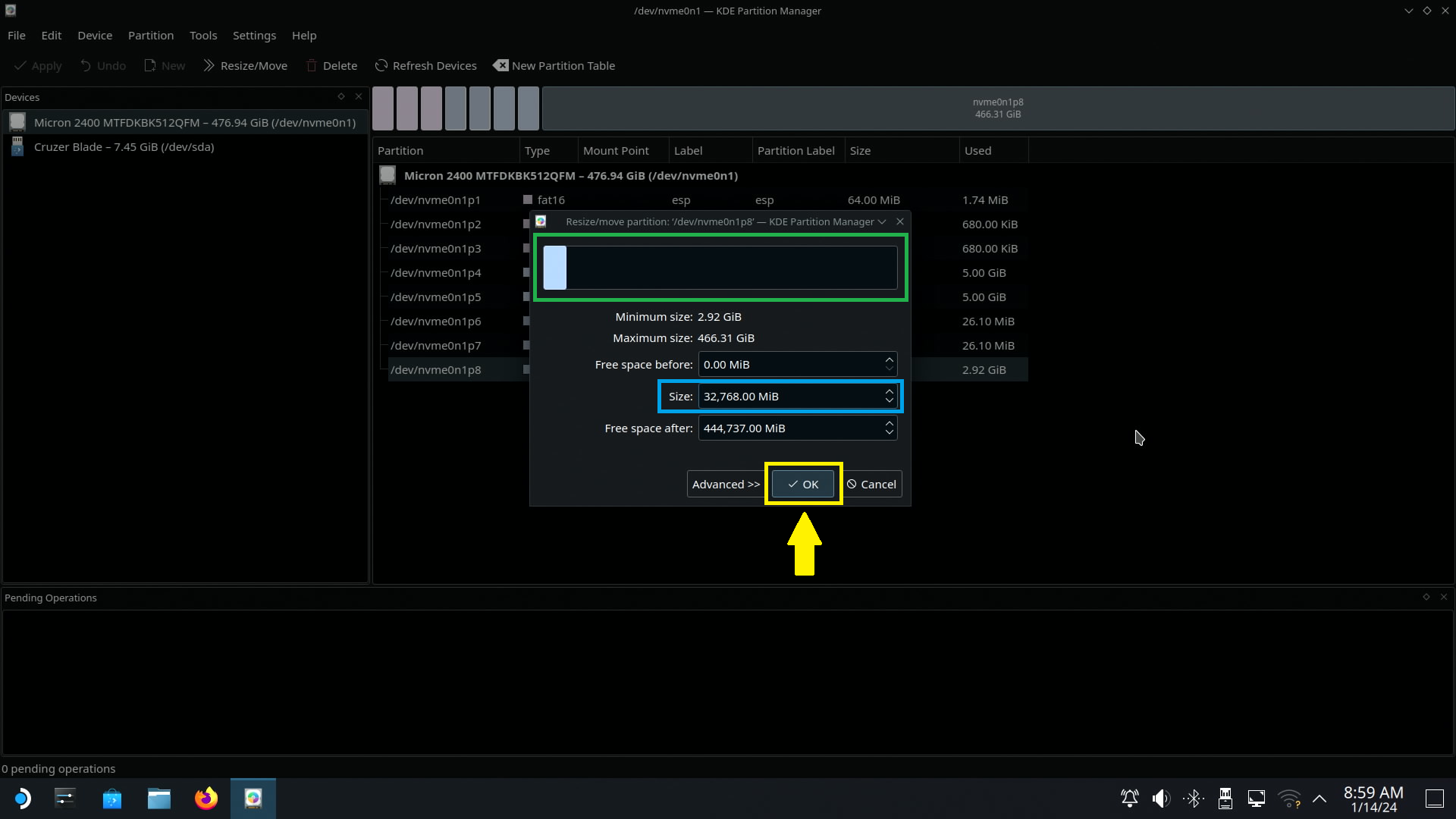 그대로 Apply Pending Operations 버튼을 클릭합니다. (노란색 박스)