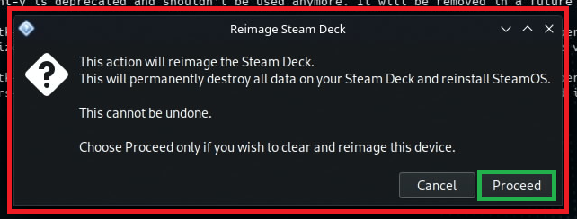 * 껐다 켜서 스팀덱을 새로 시작할건지 (Proceed), 아니면 다른 작업 더 할건지 (Cancel) 골라라.