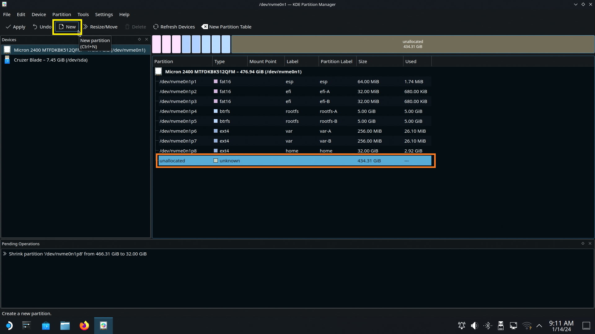 새 파티션을 생성하기 위해 unallocated 파티션을 클릭하고 (주황색 박스)