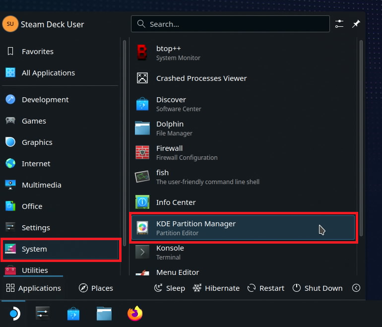 좌측 하단 스팀덱 로고 클릭 -> System -> KDE Partition Manager (KDE 파티션 매니저)를 켜줍니다.