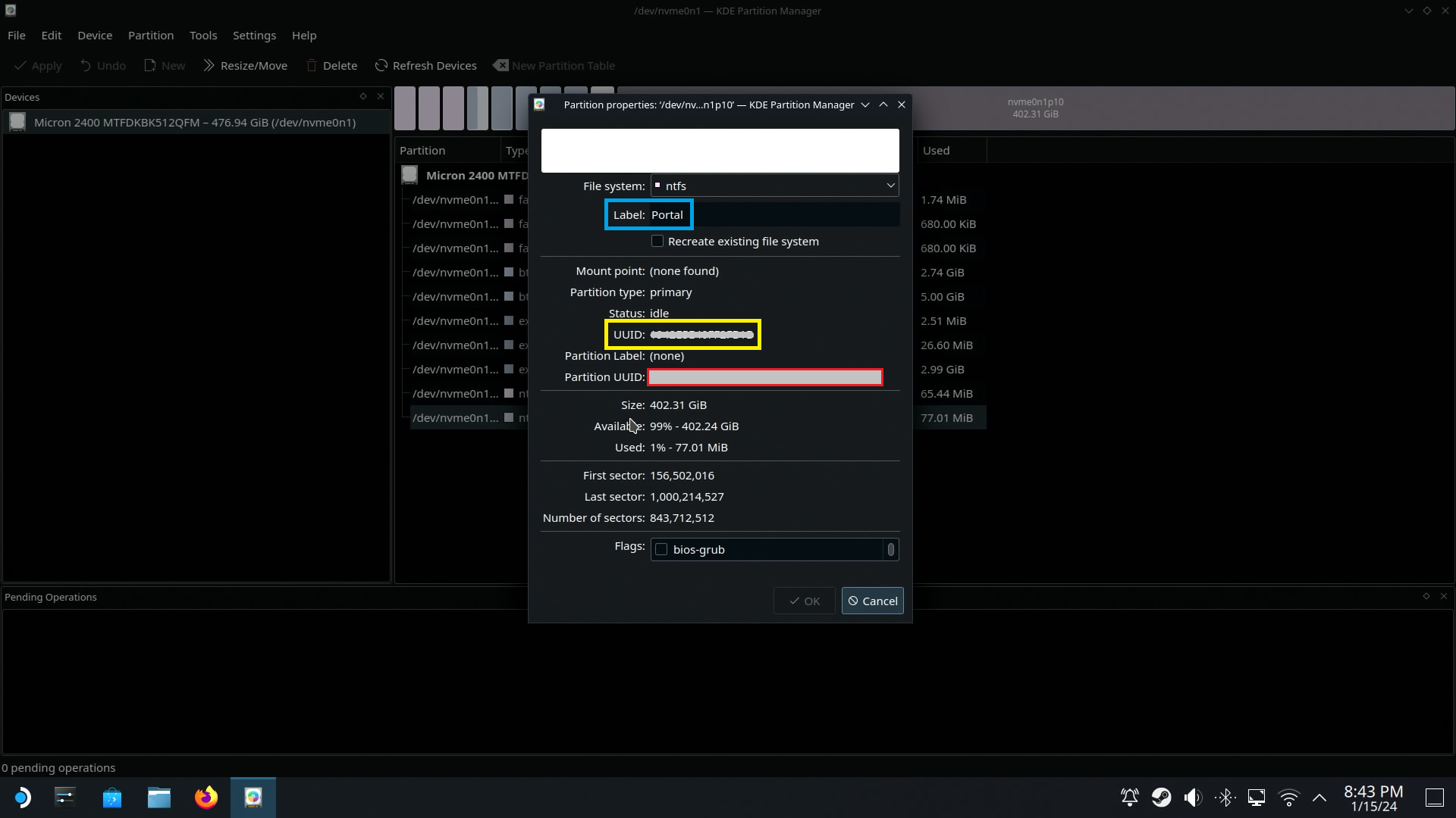 KDE가 켜지면 만들었던 하이브리드 파티션을 더블클릭해서 속성창을 열어주세요. (빨간색 박스)