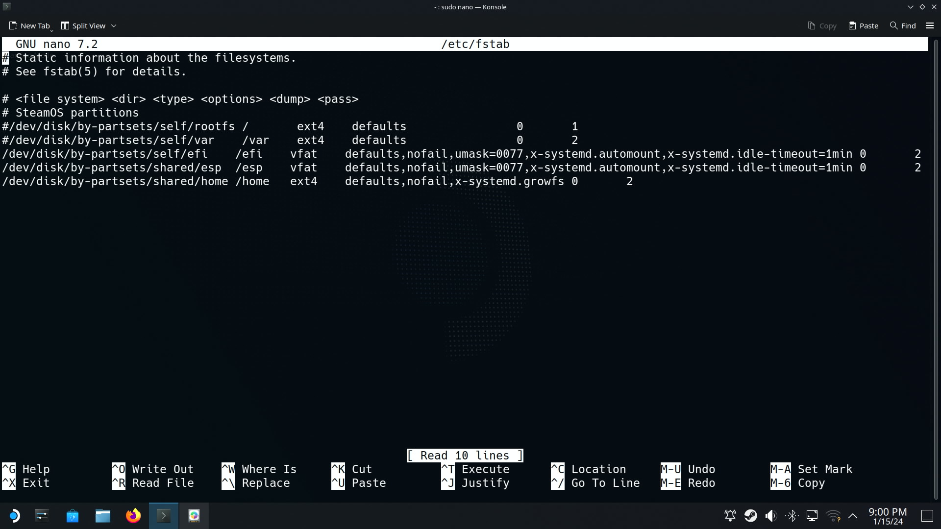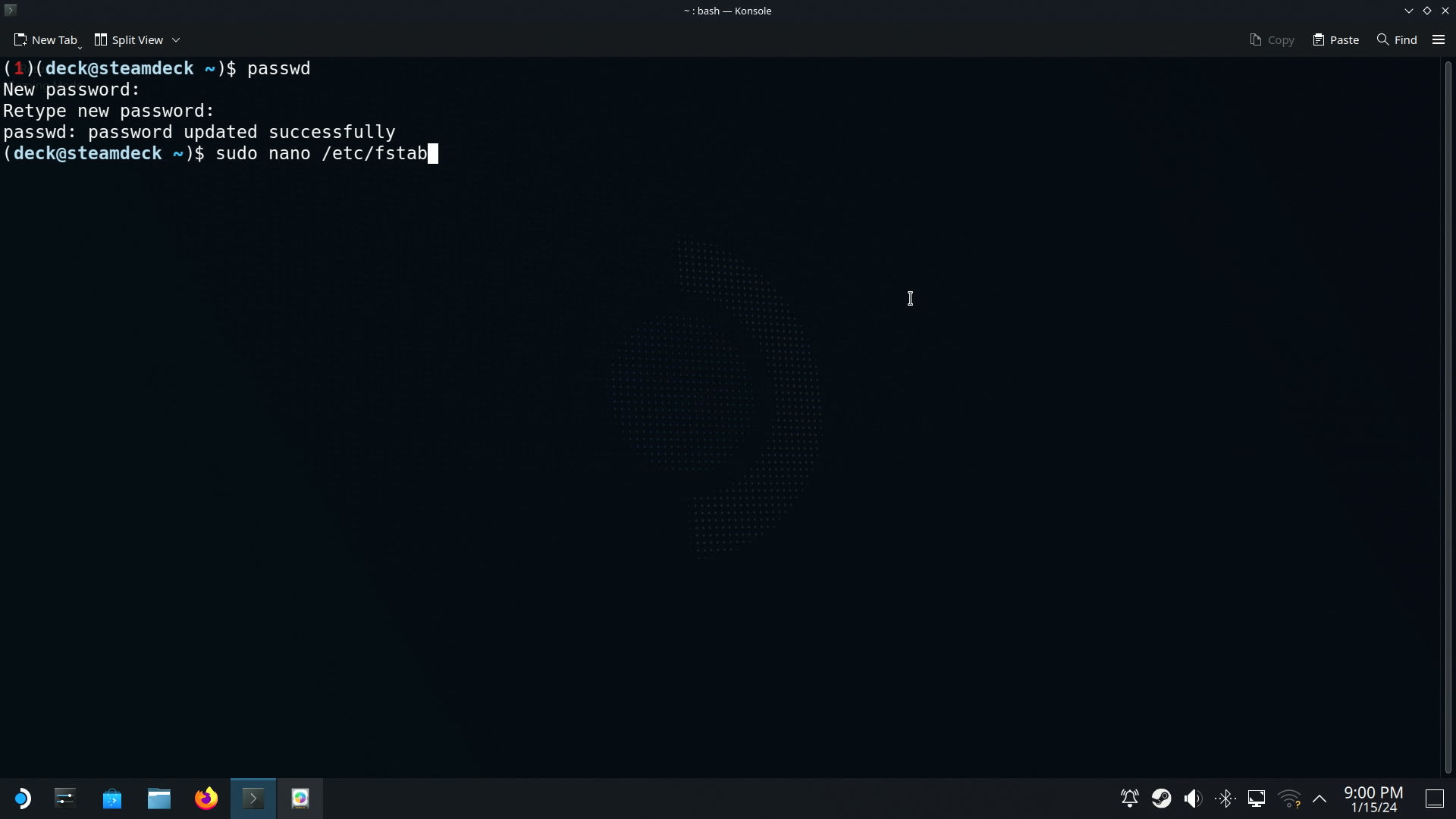 비밀번호를 잘 지정했으면 nano 편집기로 fstab을 수정해줍니다.