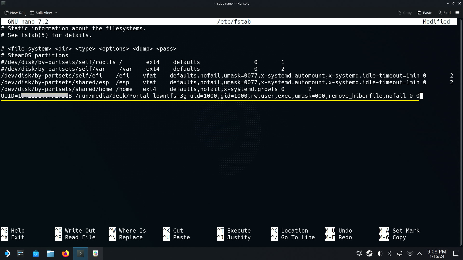 UUID=아까확인한UUID /run/media/deck/원하는폴더명 lowntfs-3g uid=1000,gid=1000,rw,user,exec,umask=000,remove_hiberfile,nofail 0 0