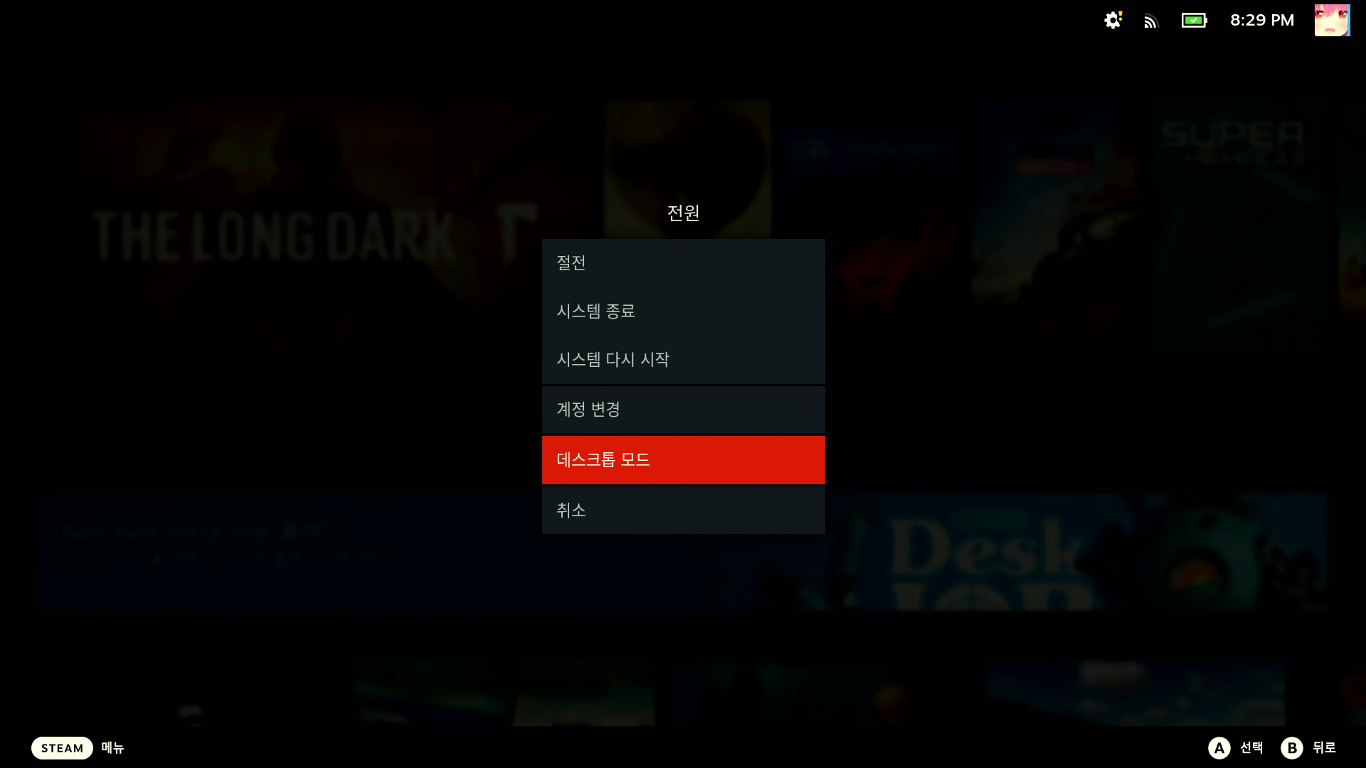 로그인도 해서 아래 사진처럼 나오면, 스팀버튼 -> 전원 -> 데스크톱 모드로 이동해줍니다.