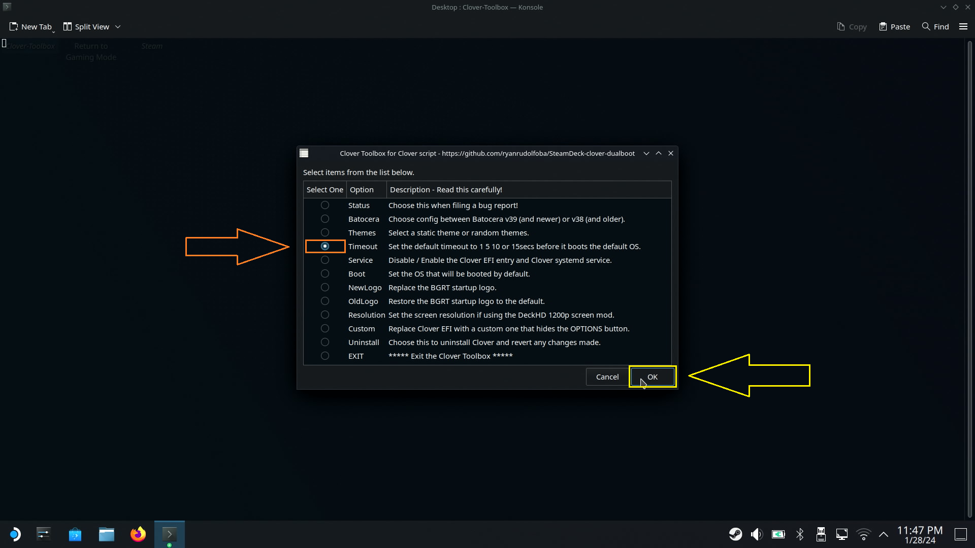 저는 말 그대로 '스팀'덱이니까 스팀OS를 선택하고 (주황색 박스) OK를 누르겠습니다. (노란색 박스)