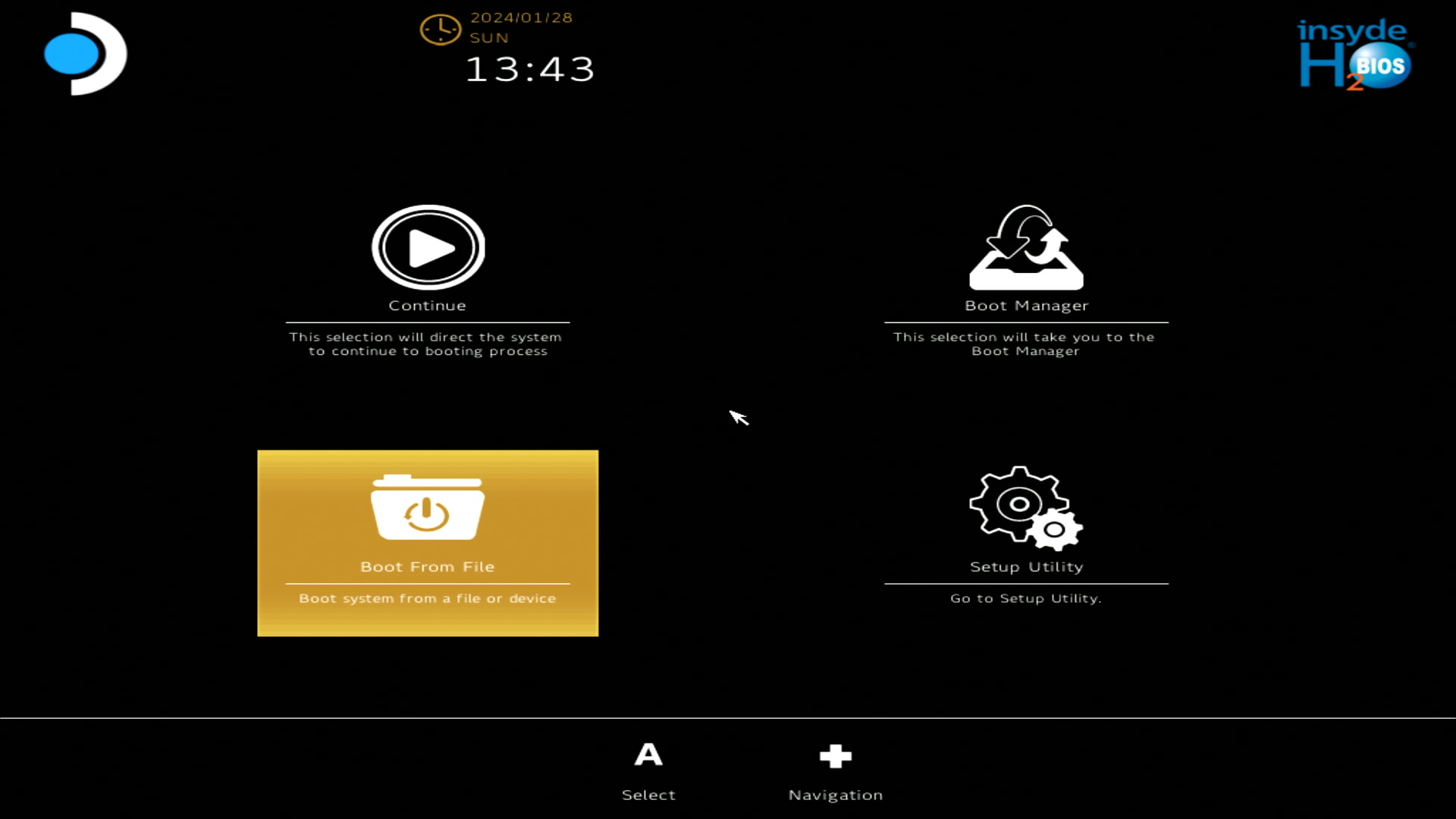아래와 같은 화면이 뜨면 Boot From File로 이동하고 A 버튼을 누릅니다.