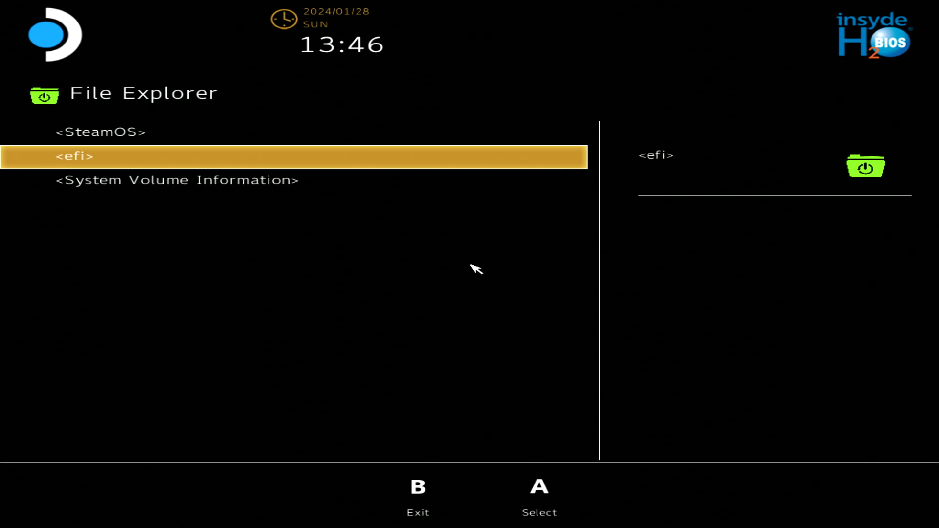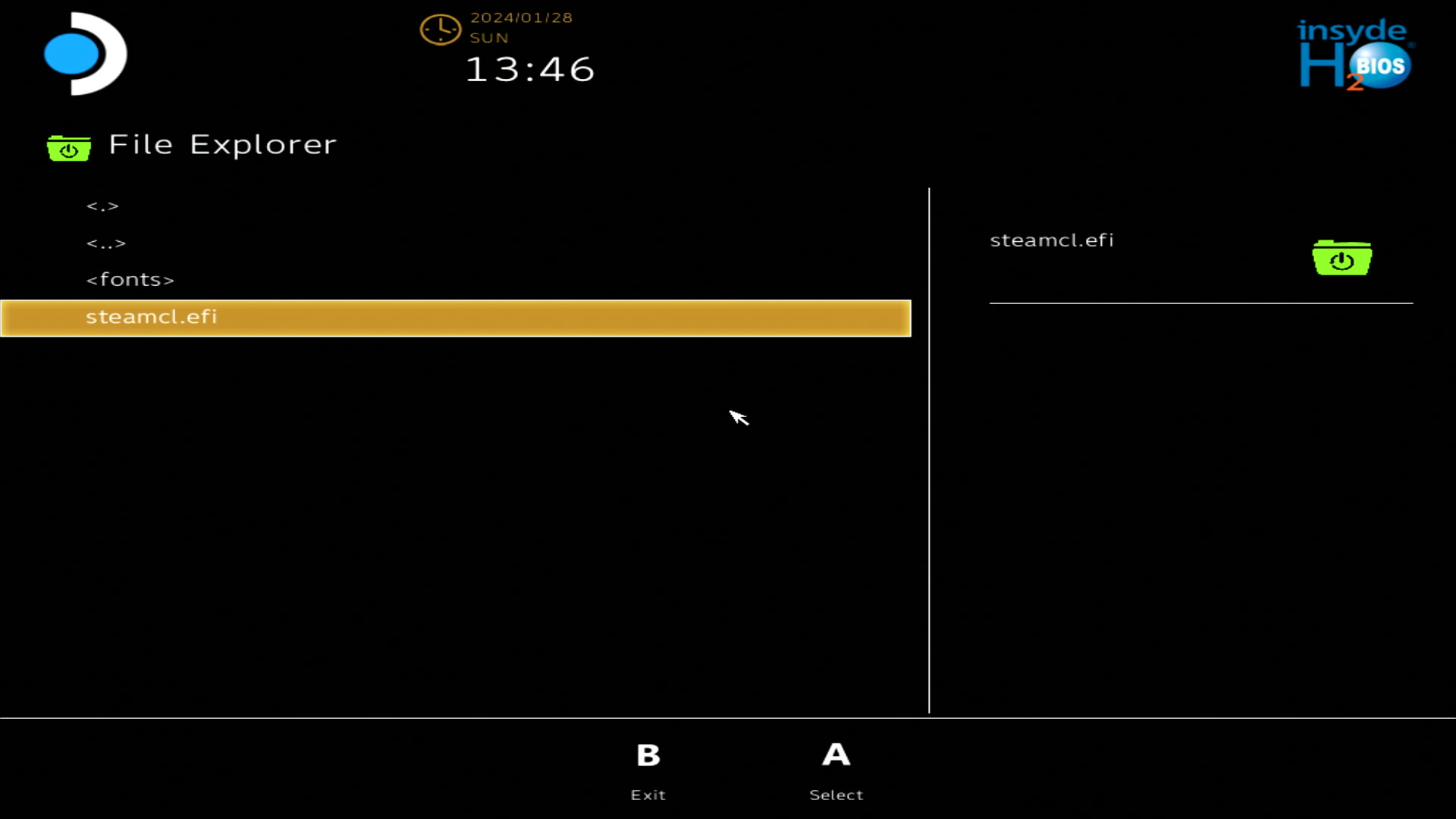 steamcl.efi를 A버튼을 눌러 클릭 (하면 스팀OS로 켜집니다.)