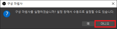 바로 OBS가 켜지면 아래 사진처럼 업데이트와 구성 마법사를 건너뛰시기 바랍니다.