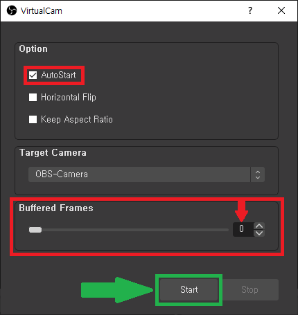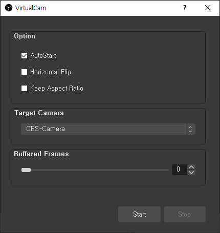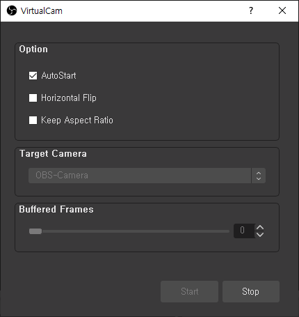 Start 버튼을 누르면 Target Camera와 Bufferd Frames가 비활성화 되며 자동으로 OBS-Camera로 캔버스에 표시되는 장면이 나가게 됩니다.