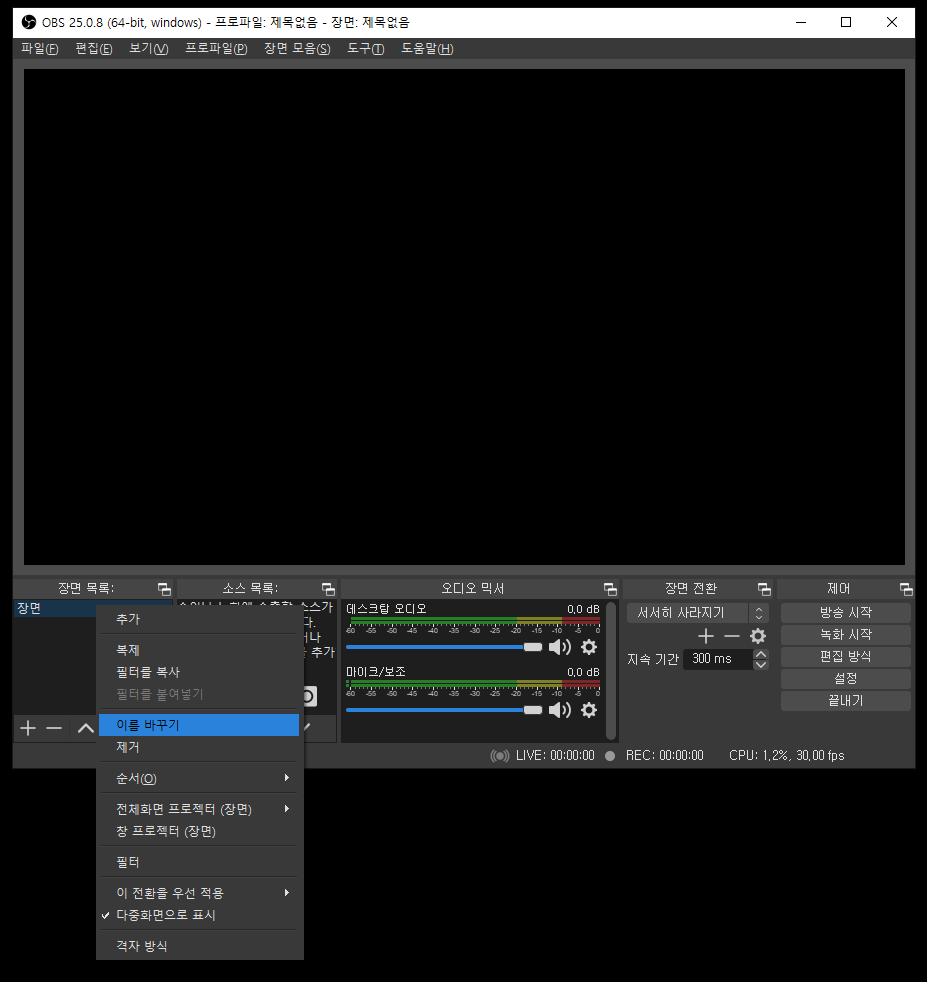 장면 목록에 있는 하위 메뉴에 마우스를 가져가고 우클릭을 하여 이름을 변경합니다. (혹은 F2 키를 누름)