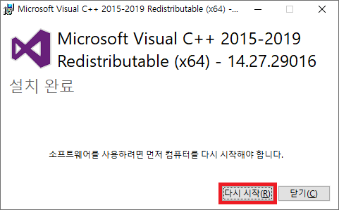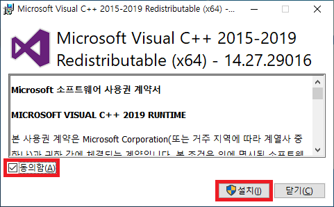 추가적으로 비주얼 스튜디오 런타임도 받아주세요. (컴퓨터에 따라 이미 설치되어있을 수 있습니다.)