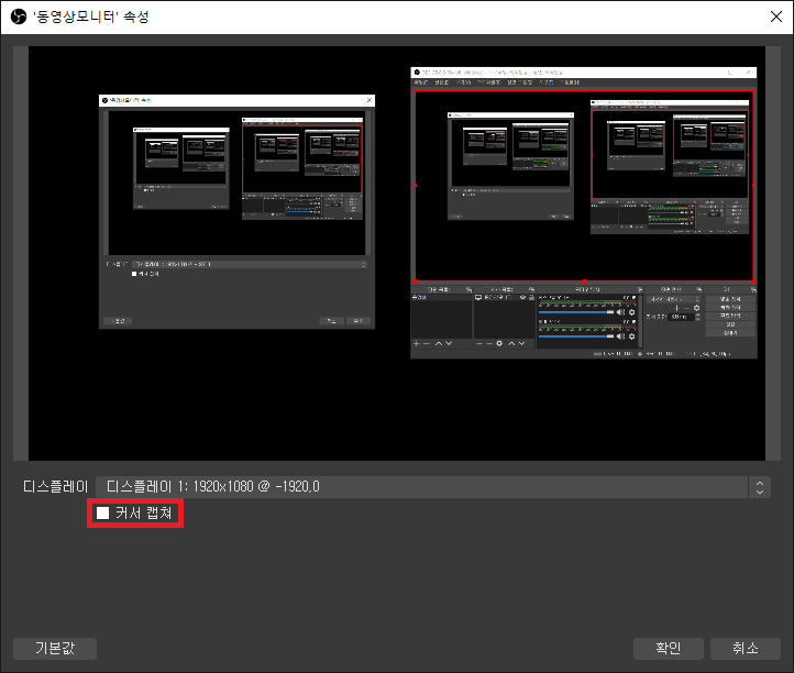 동영상을 재생할 디스플레이를 지정하고 커서 캡쳐를 체크 해제 합니다.